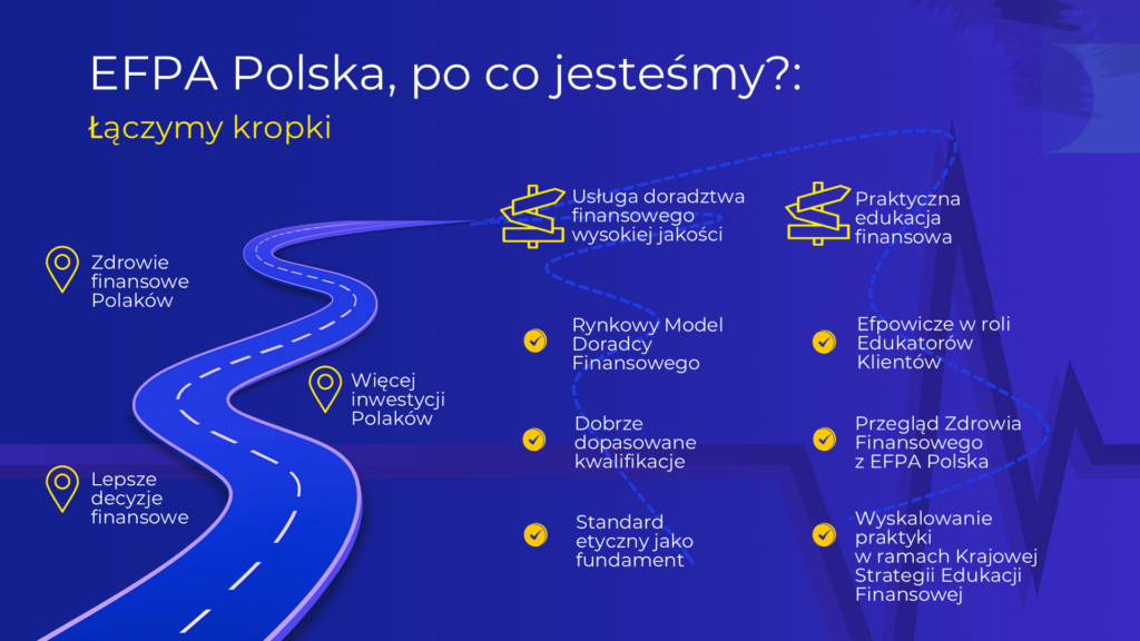 Jak zatem w dużym obrazku prezentuje się Mapa Drogowa dla Zdrowia Finansowego Polaków wg EFPA Polska. Innymi słowy, po co jesteśmy jako Społeczność Certyfikowanych Doradców Finansowych EFPA Polska?