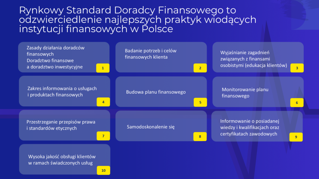 Podążanie za standardem będzie wyrazem profesjonalizmu, będzie podnosiło rangę zawodu doradcy finansowego. Będzie wizytówką jakości i rzetelności doradców, a dla klienta rękojmią najwyższych standardów usług, świadczonych przez doradców.