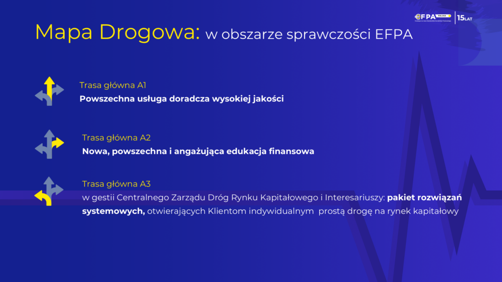 Aby to osiągnąć, potrzebujemy – po pierwsze – powszechnego dostępu do usługi doradztwa finansowego wysokiej jakości, Trasa Główna A1. Elementami infrastruktury trasy głównej A1, budowanej przez EFPA Polska są: