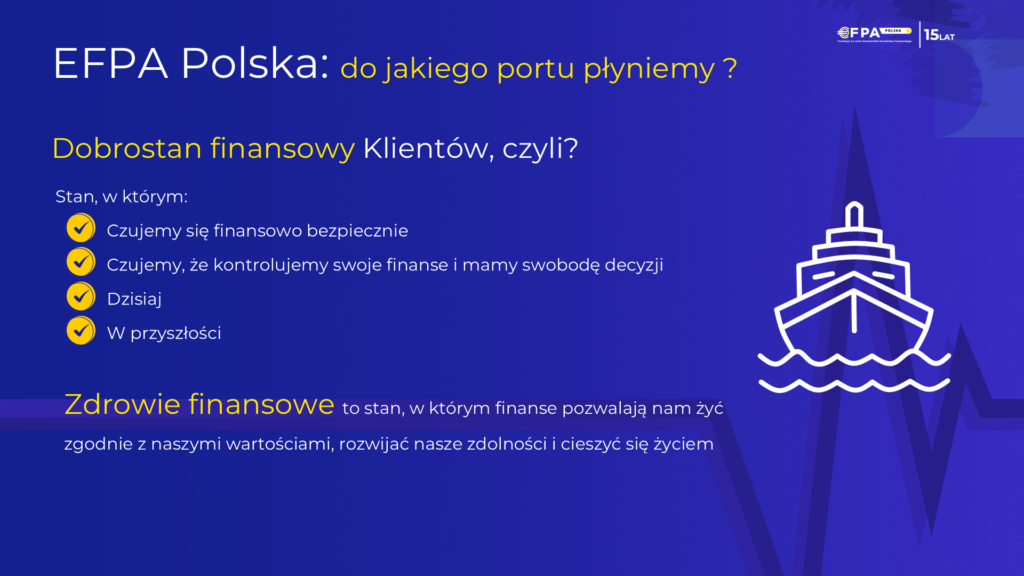 W EFPA Polska patrzymy ku przyszłości. Lubimy też budować, krok po kroku, konsekwentnie, bez utraty jakości i z uważnością. Niestrudzenie szukamy wartościowych celów, które ukierunkują nasze działanie, nadadzą mu realny sens i lepiej zakomunikują naszym Klientom i Partnerom, po co jesteśmy jako Społeczność Certyfikowanych Doradców Finansowych EFPA. Na 15-lecie EFPA Polska deklarujemy, że naszym portem jest zdrowie finansowe naszych Klientów, czyli stan, w którym finanse pozwalają nam żyć zgodnie z naszymi wartościami, rozwijać nasz potencjał i cieszyć się życiem. Wyruszamy w rejs. Inicjujemy koalicję na rzecz zdrowia finansowego Polaków i zapraszamy Was do przyłączenia się do #TEAMZdrowieFinansowe.